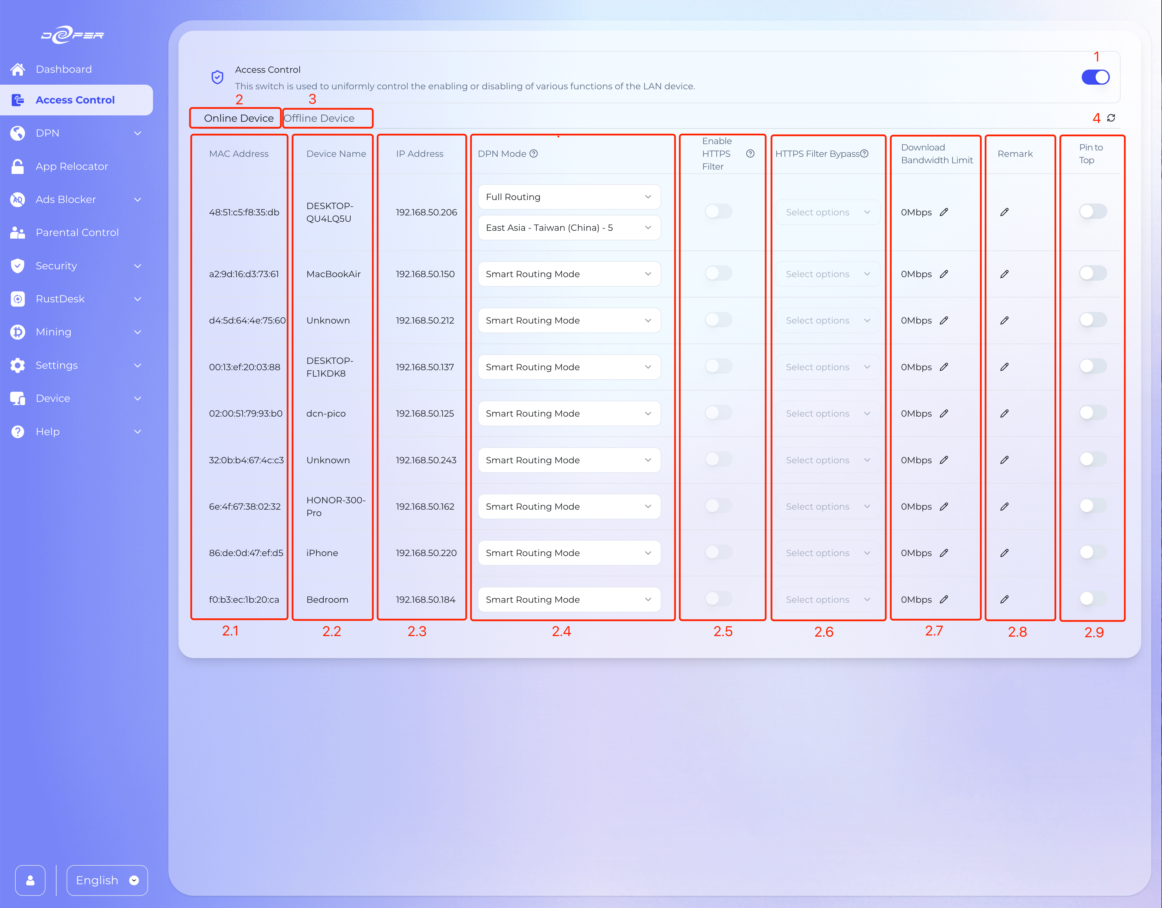 This feature is used to uniformly control the opening or closing of various functions of LAN devices protected by the Deeper Connect.
