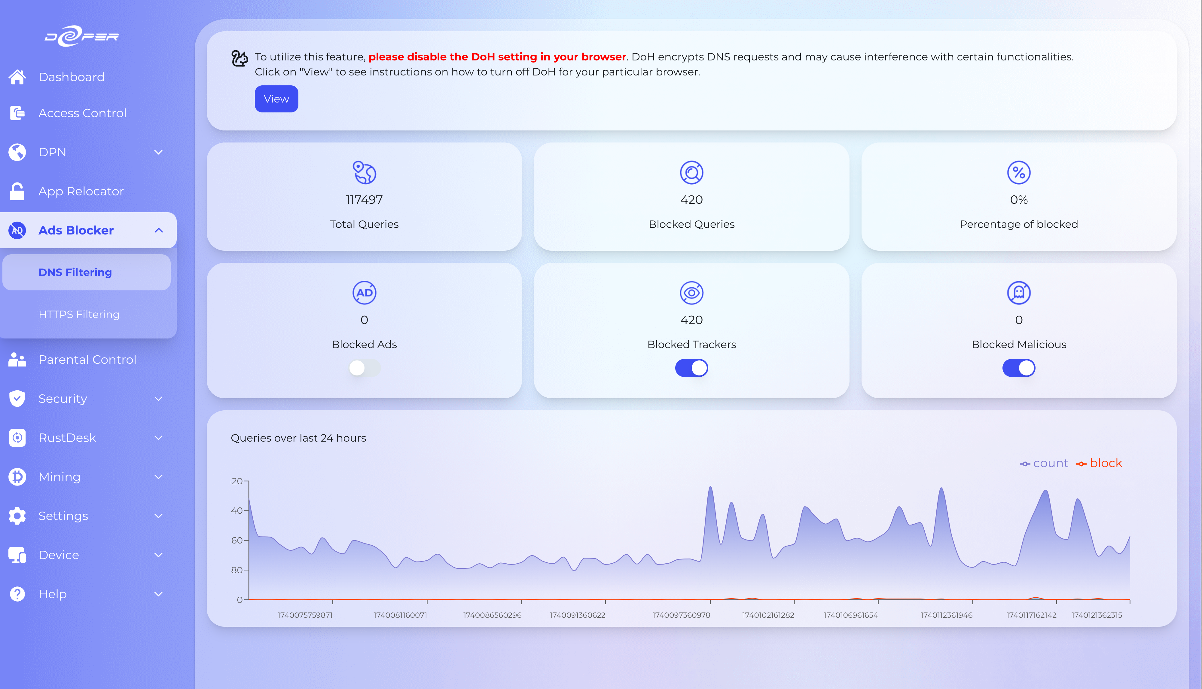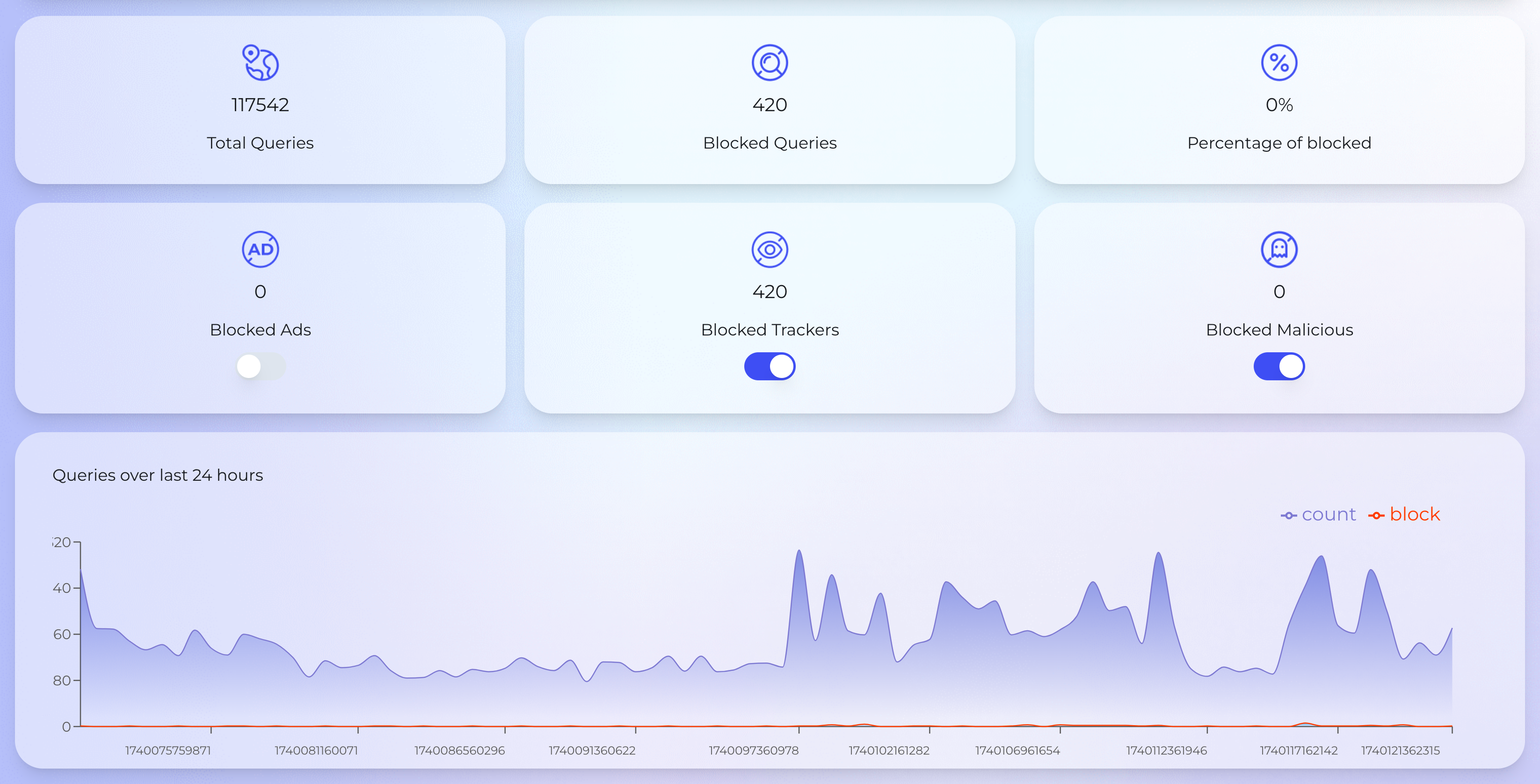 The DNS Filtering primarily intercepts ads, tracking codes, and web page-imbedded malware in DNS access requests.&#x20;