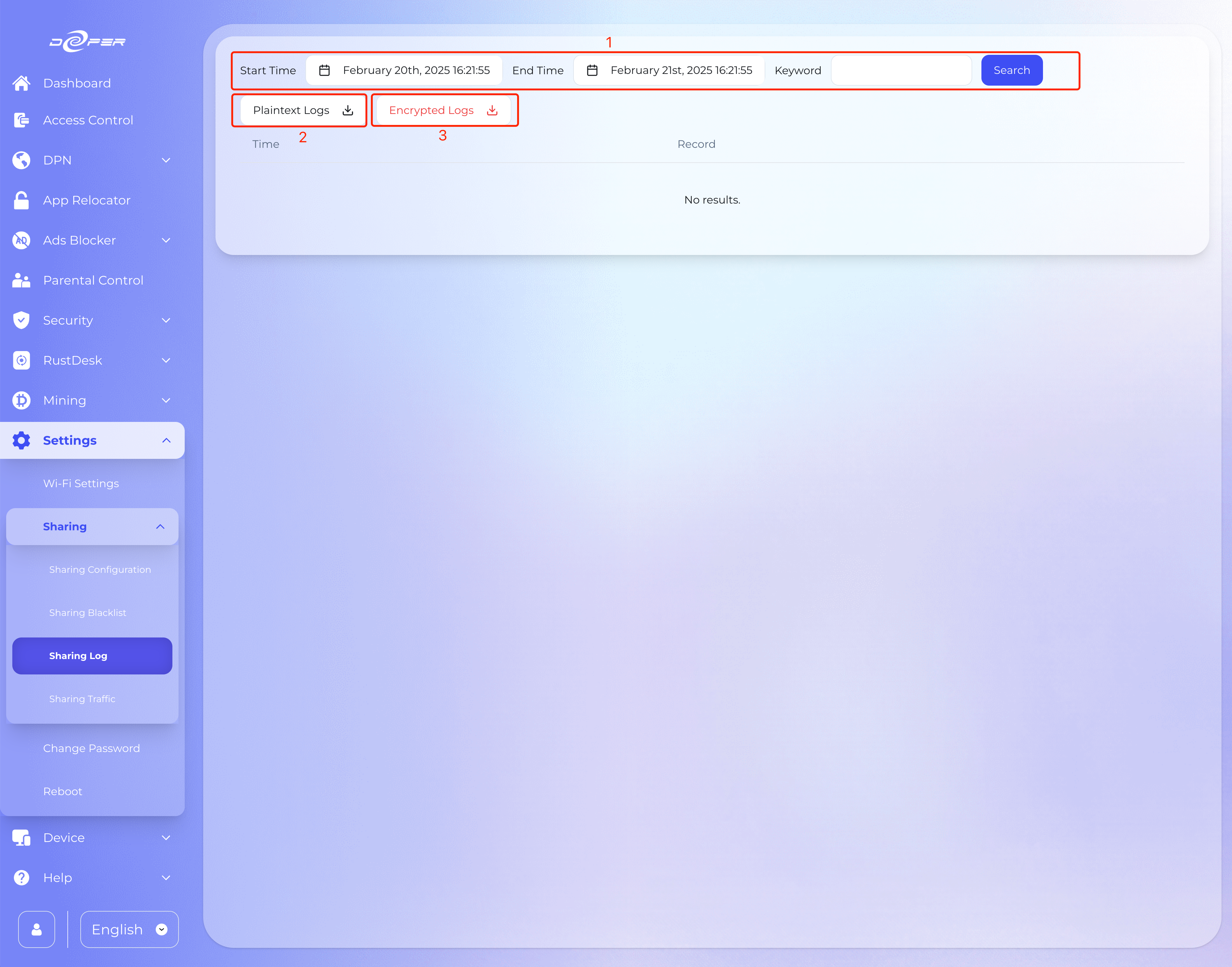 **Section 1:** Selects a time period to show logs of domains and IP addresses accessed through shared traffic. A keyword search is available to look for specific content.