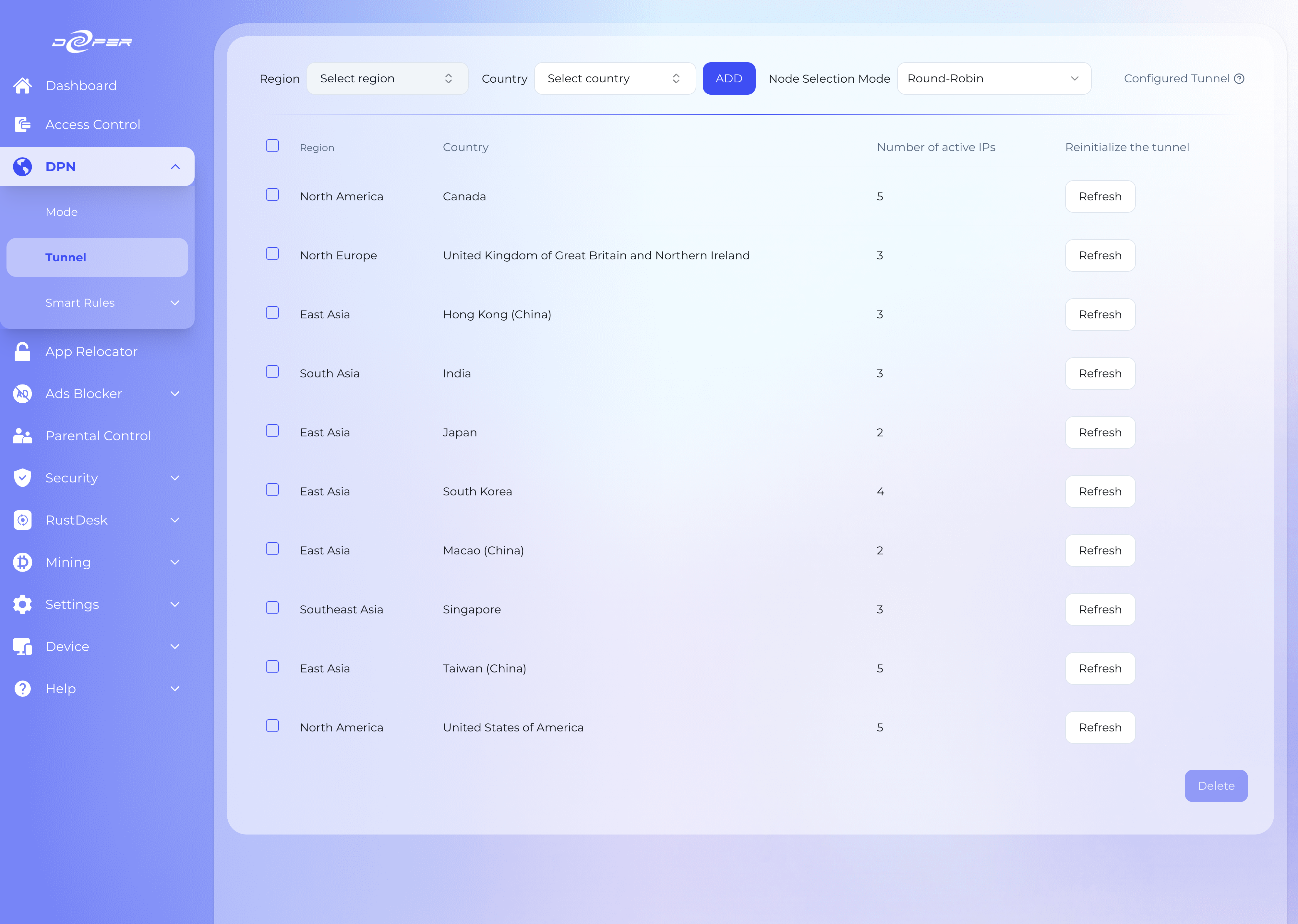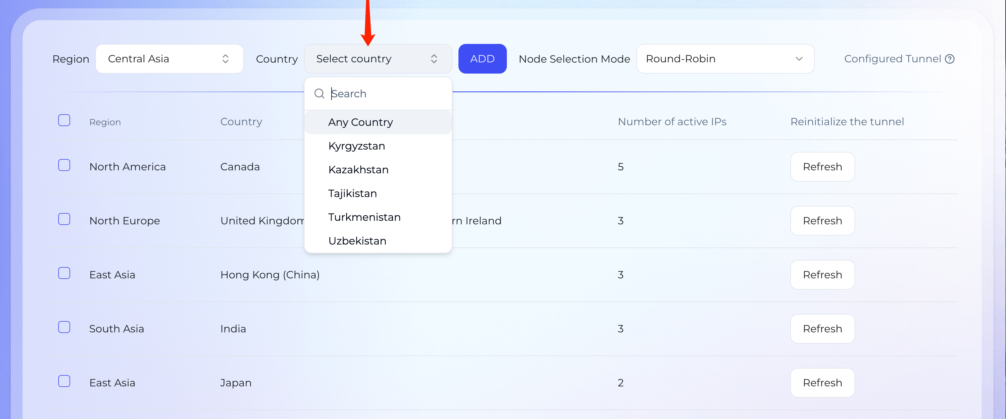 When creating a new tunnel, please select the region first, then the country, and click "**ADD**" to add a tunnel.